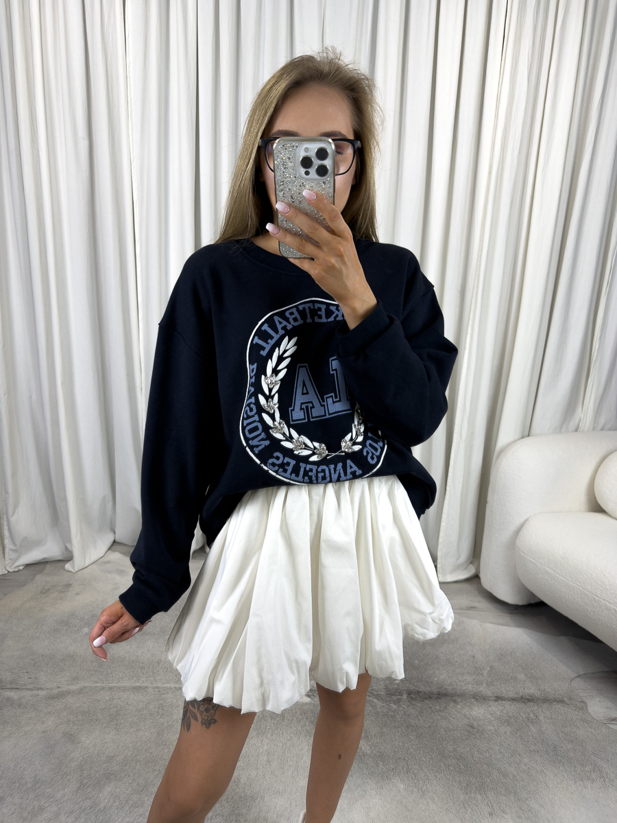 Bluza oversize College granatowa idealnie wpisuje się w styl athleisure, gdzie sportowa wygoda łączy się z miejską estetyką. Możesz zestawić ją z jeansami skinny, legginsami, joggerami lub spódnicą mini, tworząc kontrastowy look z kobiecym akcentem.