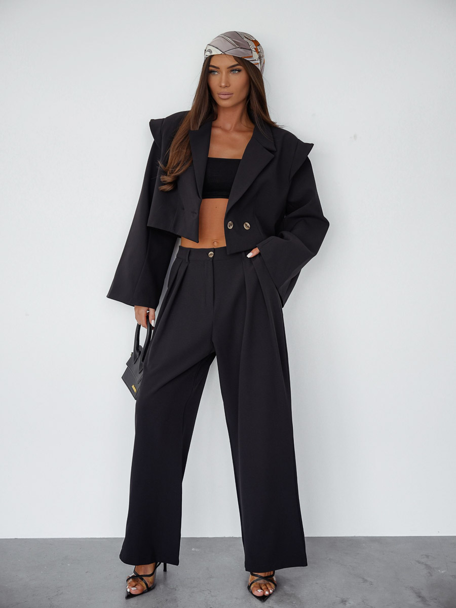 - Dwuczęściowy komplet: krótka marynarka + szerokie spodnie z wysokim stanem