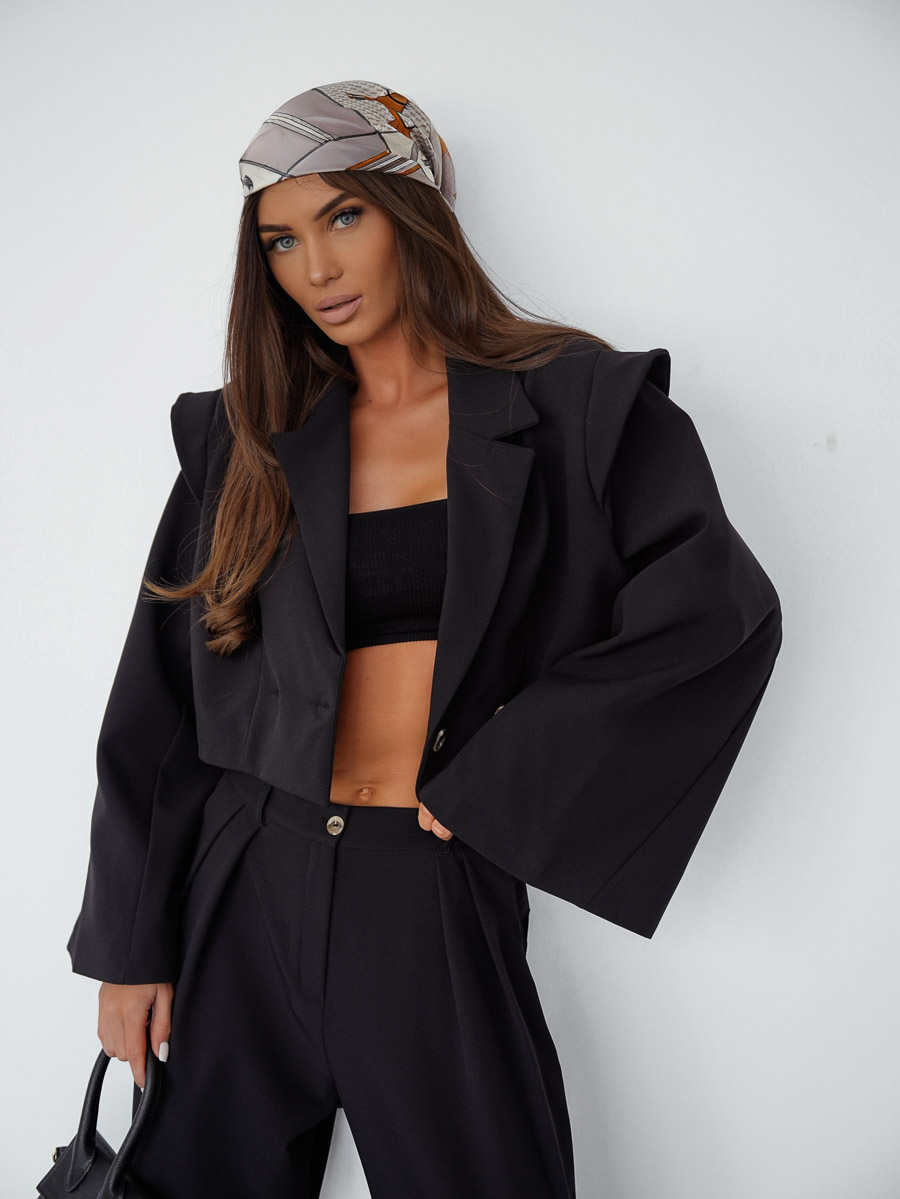 Krótka marynarka przyciąga uwagę nietuzinkowym krojem – posiada szerokie rękawy, mocniejszą linię ramion i ozdobne guziki, które dodają jej wyrazistości. Szerokie spodnie z wysokim stanem i zaszewkami doskonale modelują sylwetkę i zapewniają maksymalną wygodę. Całość tworzy nowoczesny look, który możesz łatwo dopasować do różnych okazji – zarówno codziennych, jak i wieczornych.