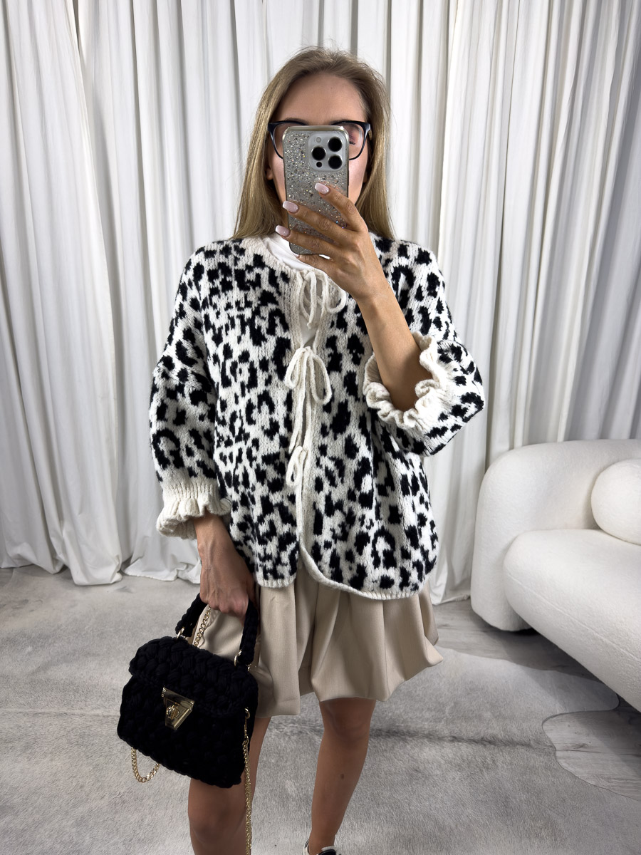 Kardigan Tessa czarny – oversize kardigan z wiązaniem, szerokimi ściągaczami i wzorem animal print. Funkcjonalny wybór na sezon przejściowy i miejskie stylizacje.