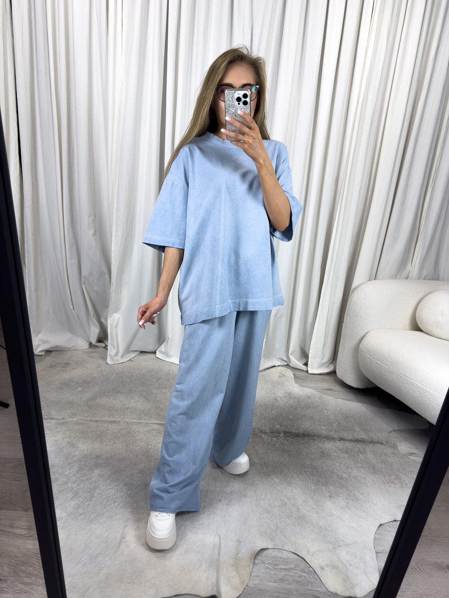 Komplet został wykonany z miękkiej, wysokogatunkowej dzianiny bawełnianej z dodatkiem elastanu, która nie tylko pięknie układa się na sylwetce, ale zapewnia przyjemność noszenia przez cały dzień. Oversizowy, luźny T-shirt z obniżoną linią ramion oraz szerokie spodnie z wysokim stanem to klasyka stylu Wiya – minimalistyczna forma z nutą nowoczesności, wpisująca się w aktualne trendy wygodnego, miejskiego looku. Pastelowy błękit, będący jednym z najbardziej pożądanych kolorów sezonu, dodaje całości świeżości i sprawia, że komplet prezentuje się wyjątkowo stylowo niezależnie od sytuacji.