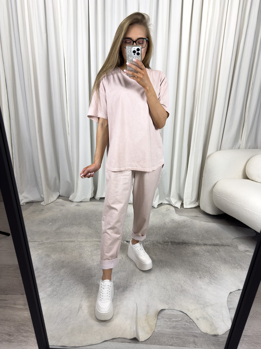 W skład kompletu wchodzi luźna, oversize’owa bluzka z krótkim rękawem oraz dopasowane spodnie o fasonie skinny z wygodnym, lekko zwężanym dołem i modnym wywinięciem nogawki. Zestaw idealnie wpisuje się w aktualne trendy casualowe i streetwearowe, sprawiając, że stworzysz z jego pomocą wiele stylizacji zarówno na co dzień, jak i na bardziej swobodne spotkania.