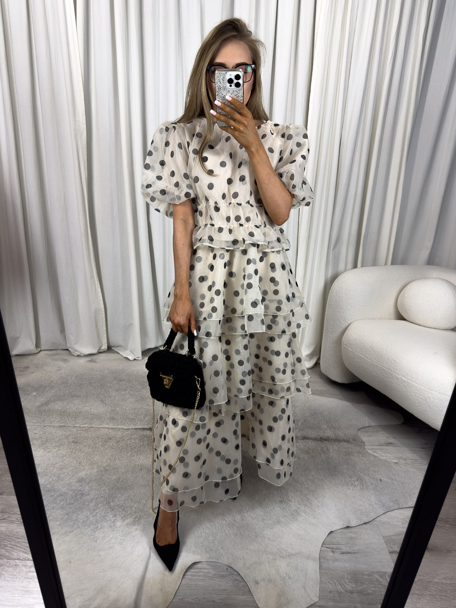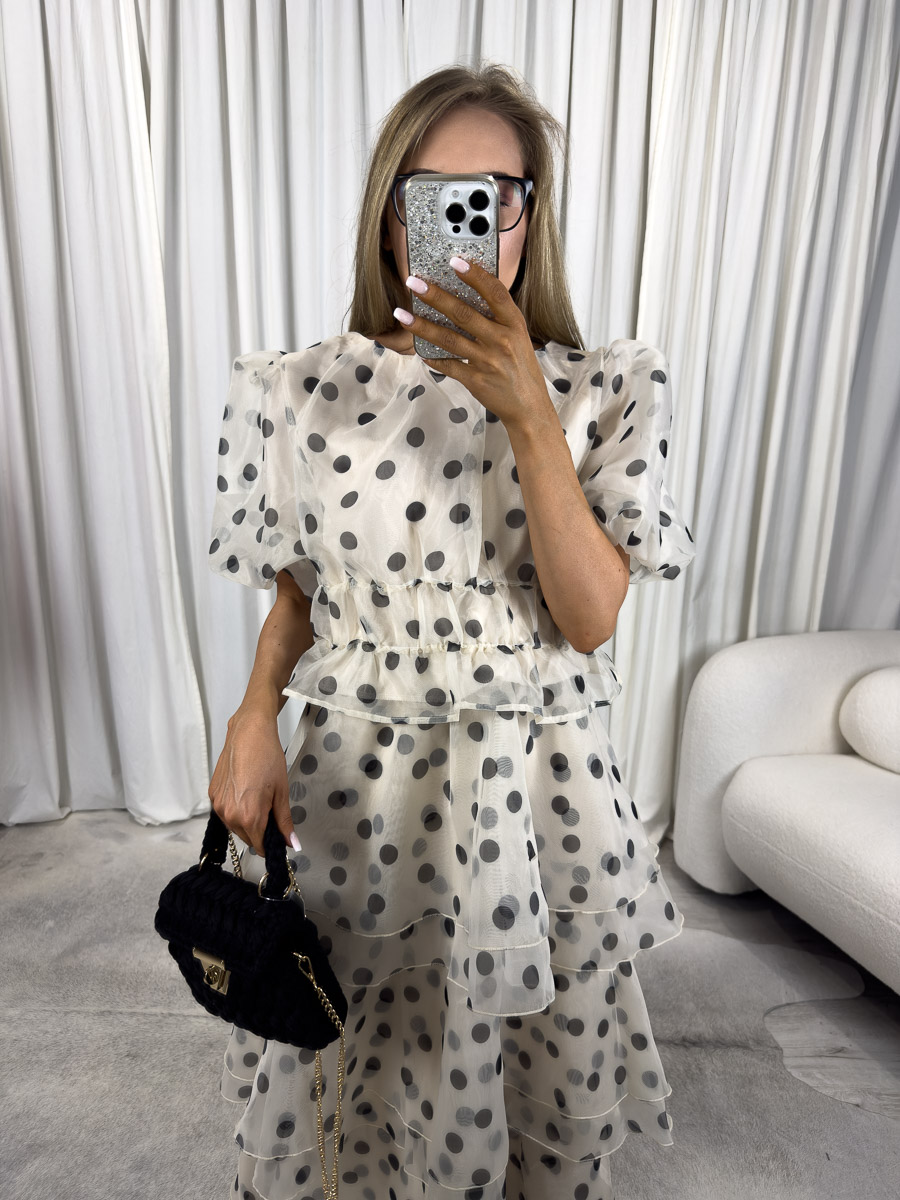 Delikatny materiał pokryty wzorem w grochy nadaje całości nutę retro, jednak falbany i przeskalowane rękawy przenoszą komplet w estetykę nowoczesnej mody. Co więcej, lekko transparentna tkanina tworzy efekt lekkości i subtelnej zmysłowości, choć dzięki podszewce pozostaje w pełni komfortowa w noszeniu. Bluzka ma lekko bufiaste rękawy oraz elastyczne wykończenie w talii, co sprawia, że dobrze układa się na różnych sylwetkach. Spódnica z kolei przyciąga wzrok warstwową konstrukcją i długością midi, która pięknie eksponuje nogi w ruchu.