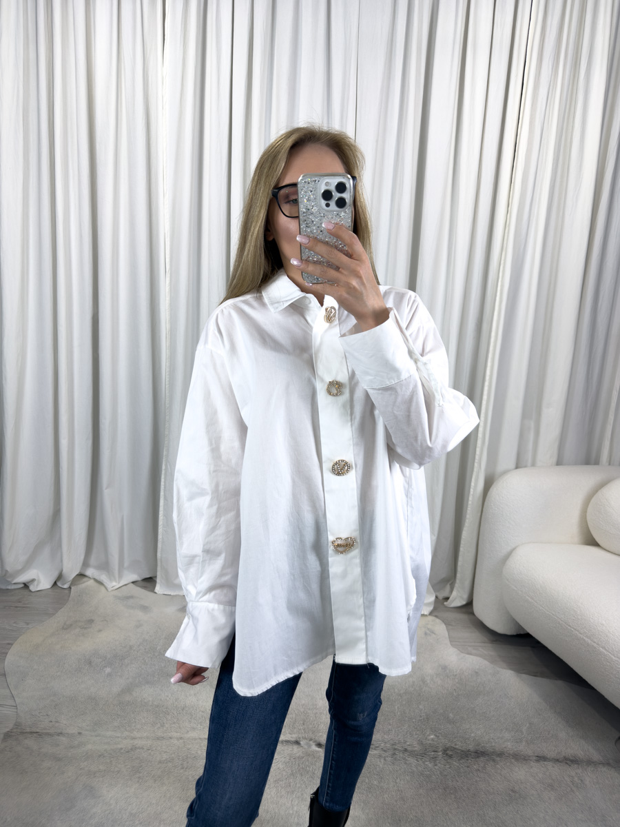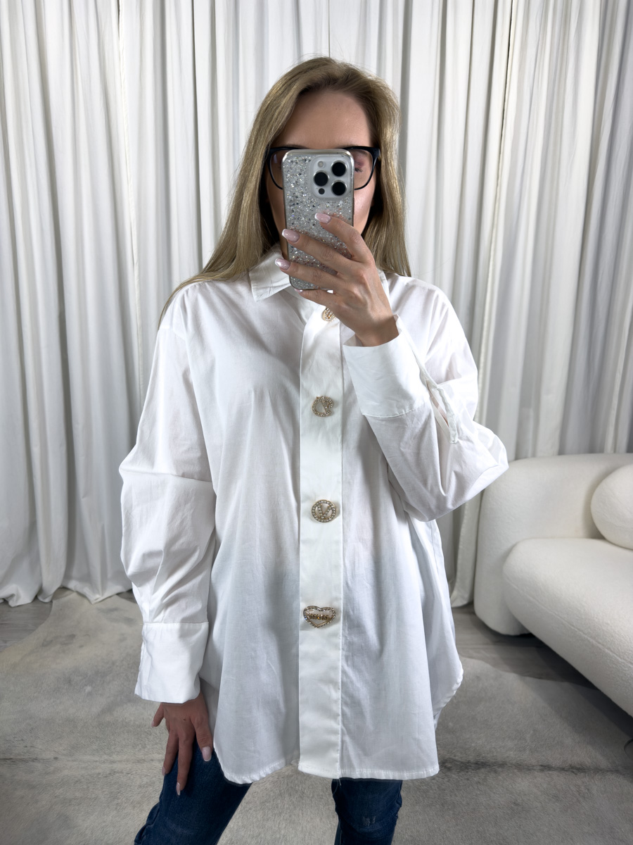Do czego pasuje biała koszula Bling z ozdobnymi guzikami?