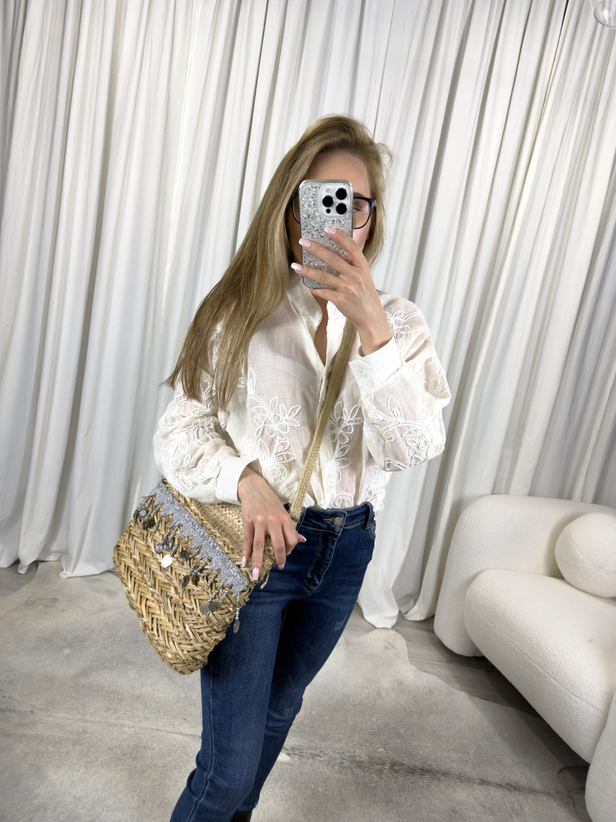 Koszula haftowana Roses to idealny wybór dla kobiet, które cenią klasyczną elegancję połączoną z delikatnym, romantycznym akcentem. Model przyciąga uwagę bogatym haftem o motywie róż, który zdobi przód, rękawy i plecy. Co więcej, biała tkanina w połączeniu z ozdobnym haftem tworzy wyjątkowo kobiecą, lekką i subtelną całość. Dzięki klasycznemu kołnierzykowi oraz zapięciu na guziki koszula świetnie sprawdzi się zarówno na co dzień, jak i na eleganckie okazje.