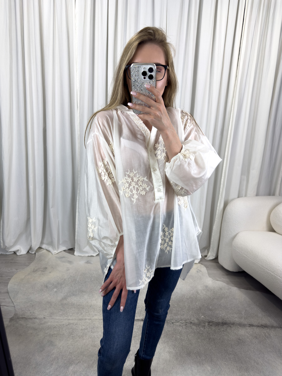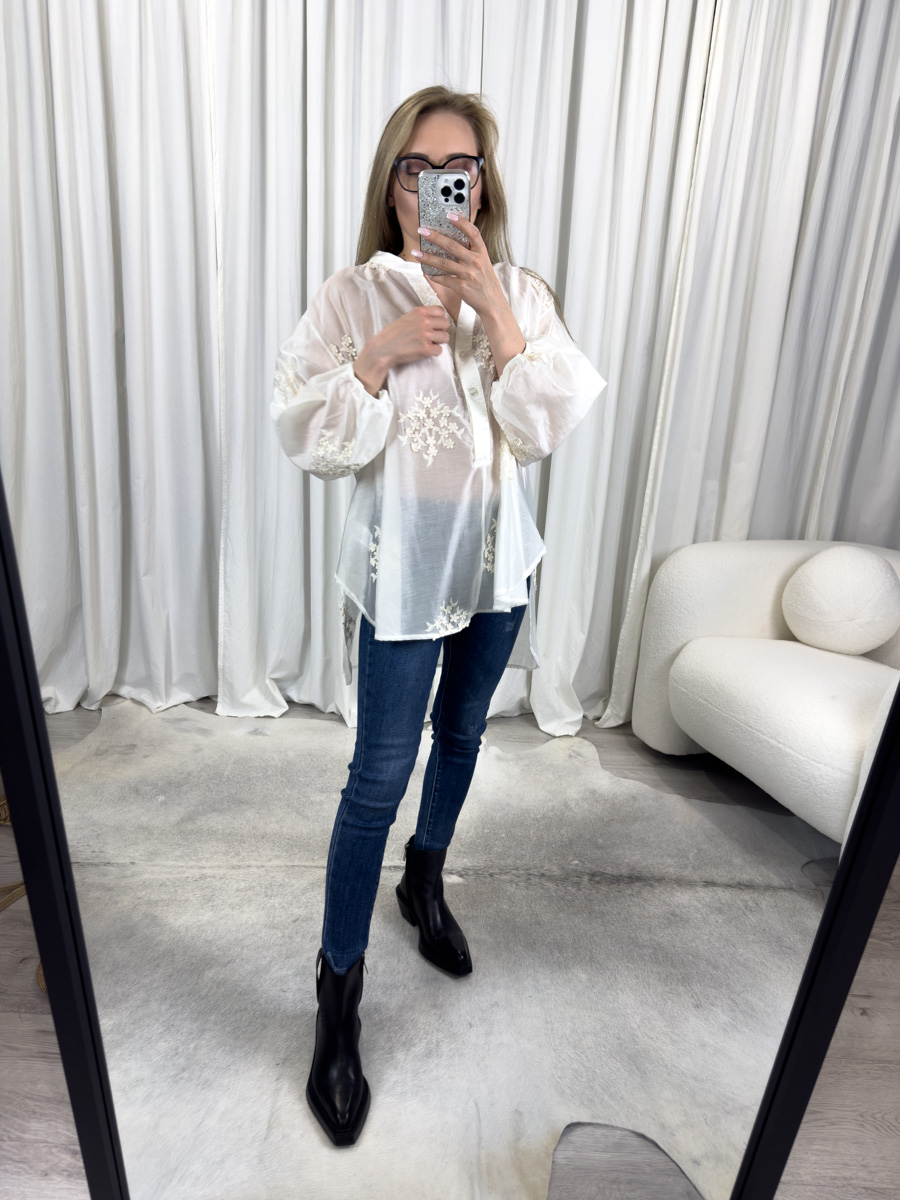 Model wyróżnia się starannymi detalami. Hafty kwiatowe umieszczone na rękawach oraz w dolnej części koszuli nadają jej wyjątkowego charakteru. Z kolei luźny fason oraz lekko rozszerzane rękawy zakończone elastycznym mankietem sprawiają, że koszula mgiełka Nature jest nie tylko efektowna, ale również wygodna.