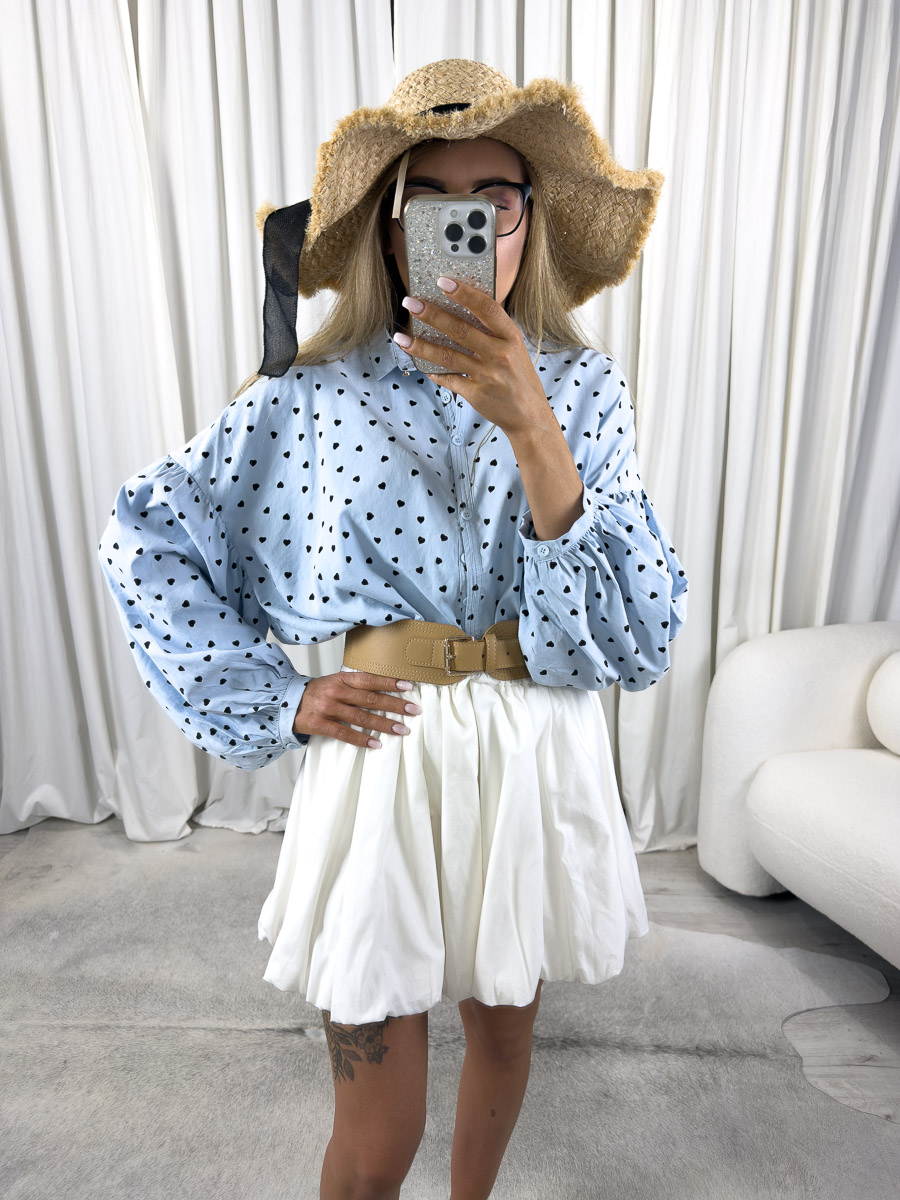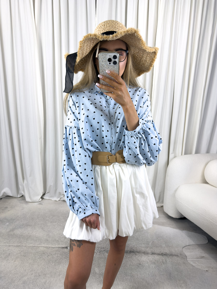 Koszula Nina Wiya w kolorze błękitnym z nadrukiem serduszek. Oversize, miękka tkanina i romantyczny włoski styl w jednym.