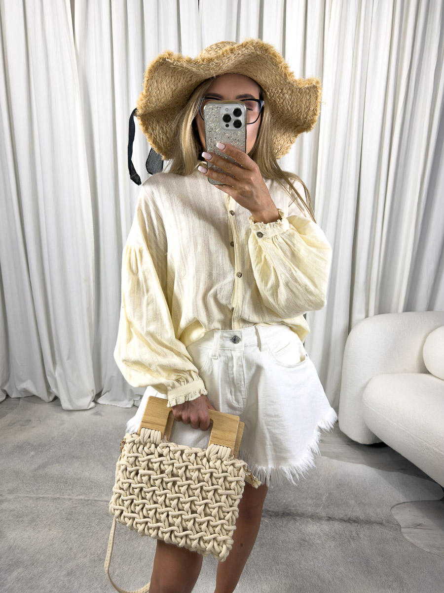 Koszula Paloma Wiya to esencja letniego luzu z nutą romantyzmu. Model charakteryzuje się prostym, ale bardzo kobiecym krojem z lekko rozszerzanymi rękawami i delikatną stójką. Naturalna, widocznie fakturowana tkanina zapewnia komfort noszenia, a zarazem pięknie układa się na sylwetce, tworząc stylowy efekt niewymuszonej elegancji. Subtelne przeszycia i guziki dobrane ton w ton dodają całości spójnego wyglądu.