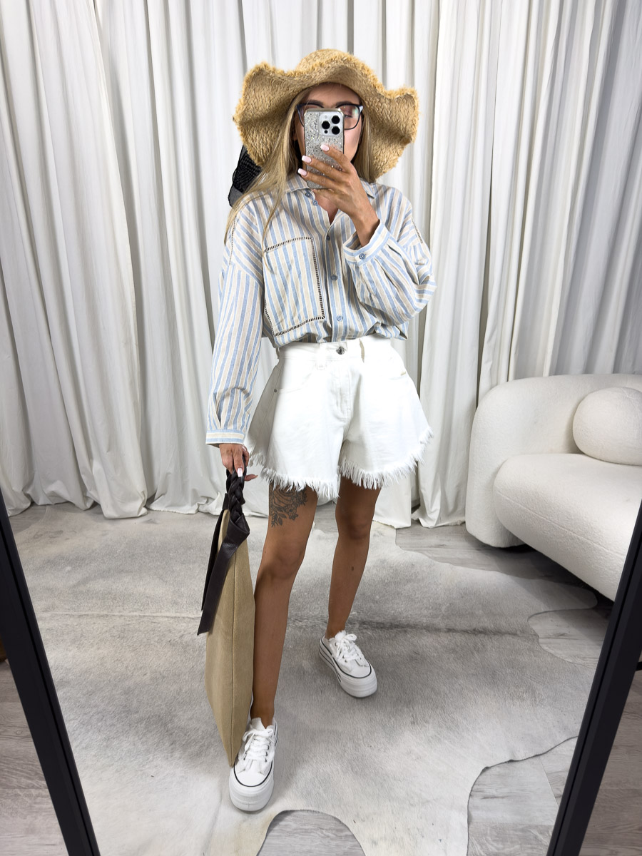 Koszula Stripe Wiya świetnie wygląda z jeansowymi szortami, lnianymi spodniami lub legginsami. Możesz założyć ją na strój kąpielowy, jeśli szukasz stylizacji na plażę. W miejskim wydaniu połącz ją z topem i białymi sneakersami, to uniwersalny element garderoby, który doda stylizacji luzu i koloru.