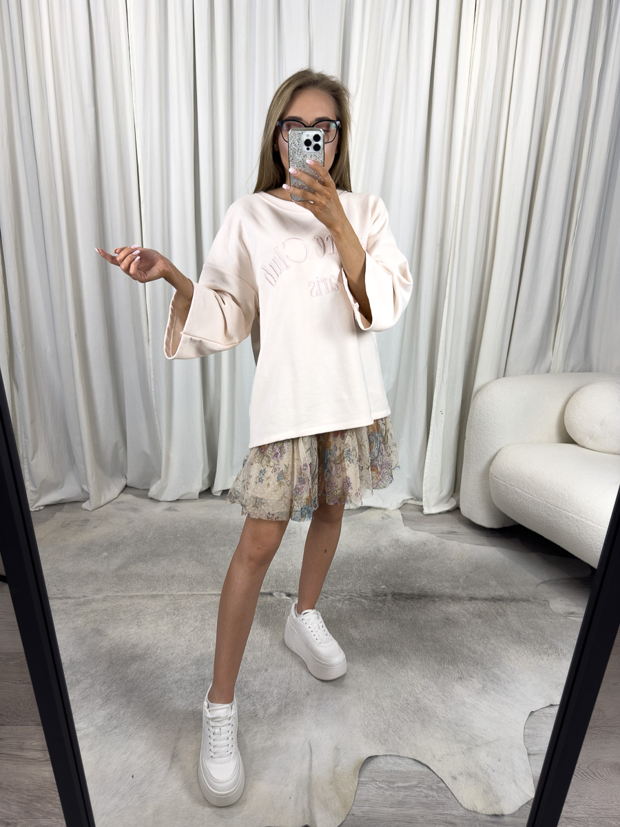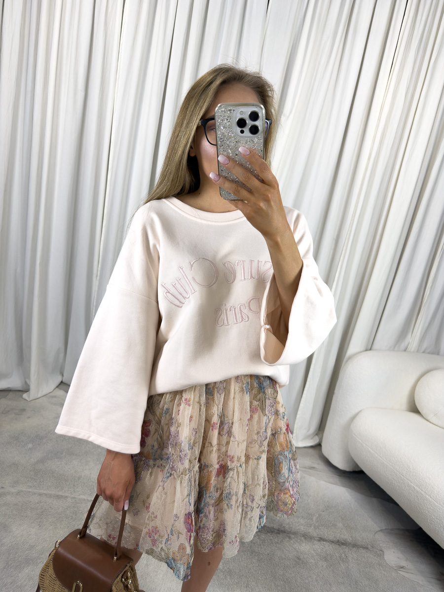 Model wyróżnia się luźnym, oversize’owym krojem z szerokimi rękawami 3/4 oraz subtelnym dekoltem łódkowym, który pięknie eksponuje linię ramion, nadając sylwetce lekkości i kobiecego charakteru. Delikatny haft z napisem „Leisure Club Paris” na przodzie bluzy dodaje jej stylowego, miejskiego sznytu, nawiązując do francuskiego luzu i swobody.