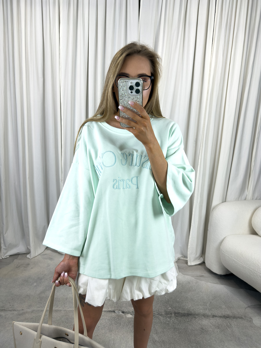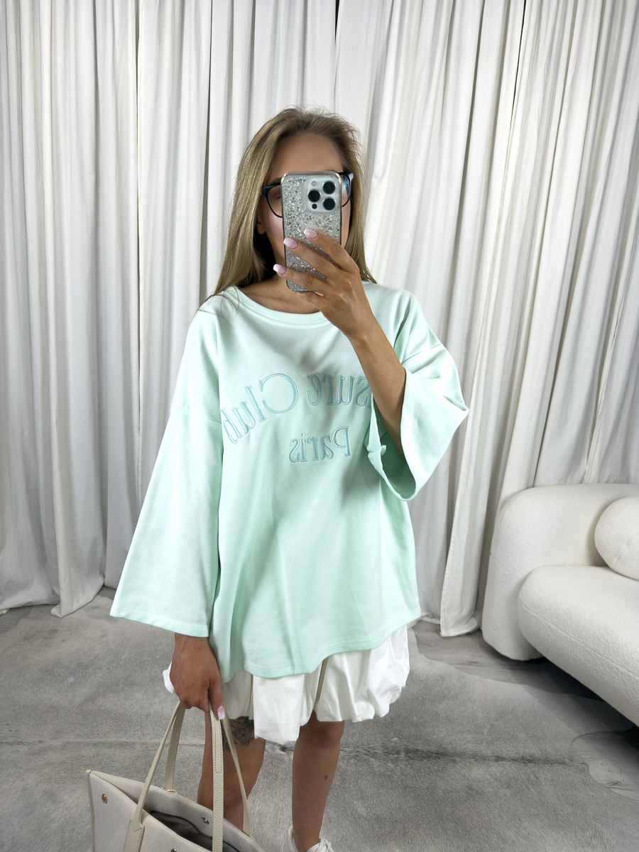 Model wyróżnia się luźnym, oversize’owym krojem z szerokimi rękawami 3/4 oraz subtelnym dekoltem łódkowym, który pięknie eksponuje linię ramion, nadając sylwetce lekkości i kobiecego charakteru. Delikatny haft z napisem „Leisure Club Paris” na przodzie bluzy dodaje jej stylowego, miejskiego sznytu, nawiązując do francuskiego luzu i swobody.