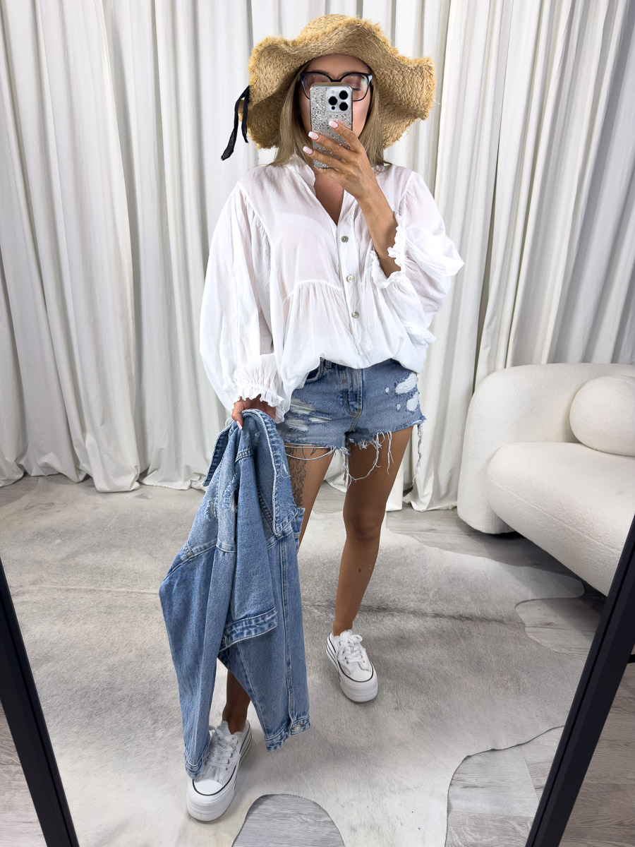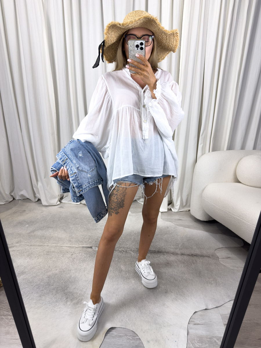 To idealna koszula na lato – zarówno na wakacje, jak i na co dzień. Możesz nosić ją do szortów z wysokim stanem, tak jak na zdjęciu, albo zestawić z dopasowanymi spodniami czy spódnicą maxi. Dzięki temu, że ma neutralny charakter, łatwo ją wystylizować z dodatkami w różnych kolorach i stylach. Dobrze wygląda też pod rozpiętą marynarką lub jeansową kurtką.