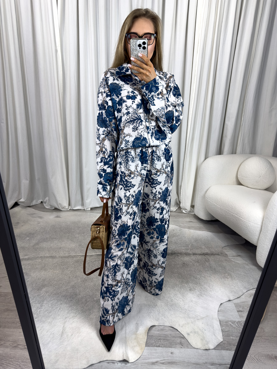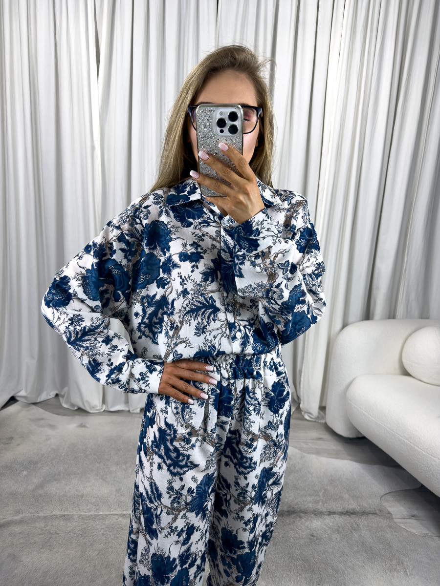 Latem liczy się nie tylko wygoda, ale i styl. Letni komplet w kwiaty Vogue łączy w sobie obie te cechy, oferując wyjątkową propozycję dla kobiet, które cenią modne rozwiązania i komfort noszenia. Składający się z luźnej koszuli z długim rękawem i szerokich spodni z wysokim stanem, komplet ten przyciąga uwagę subtelnym, ale efektownym wzorem w niebieskie kwiaty na jasnym tle. To print, który idealnie współgra z letnim klimatem – świeży, romantyczny, ale i bardzo nowoczesny.