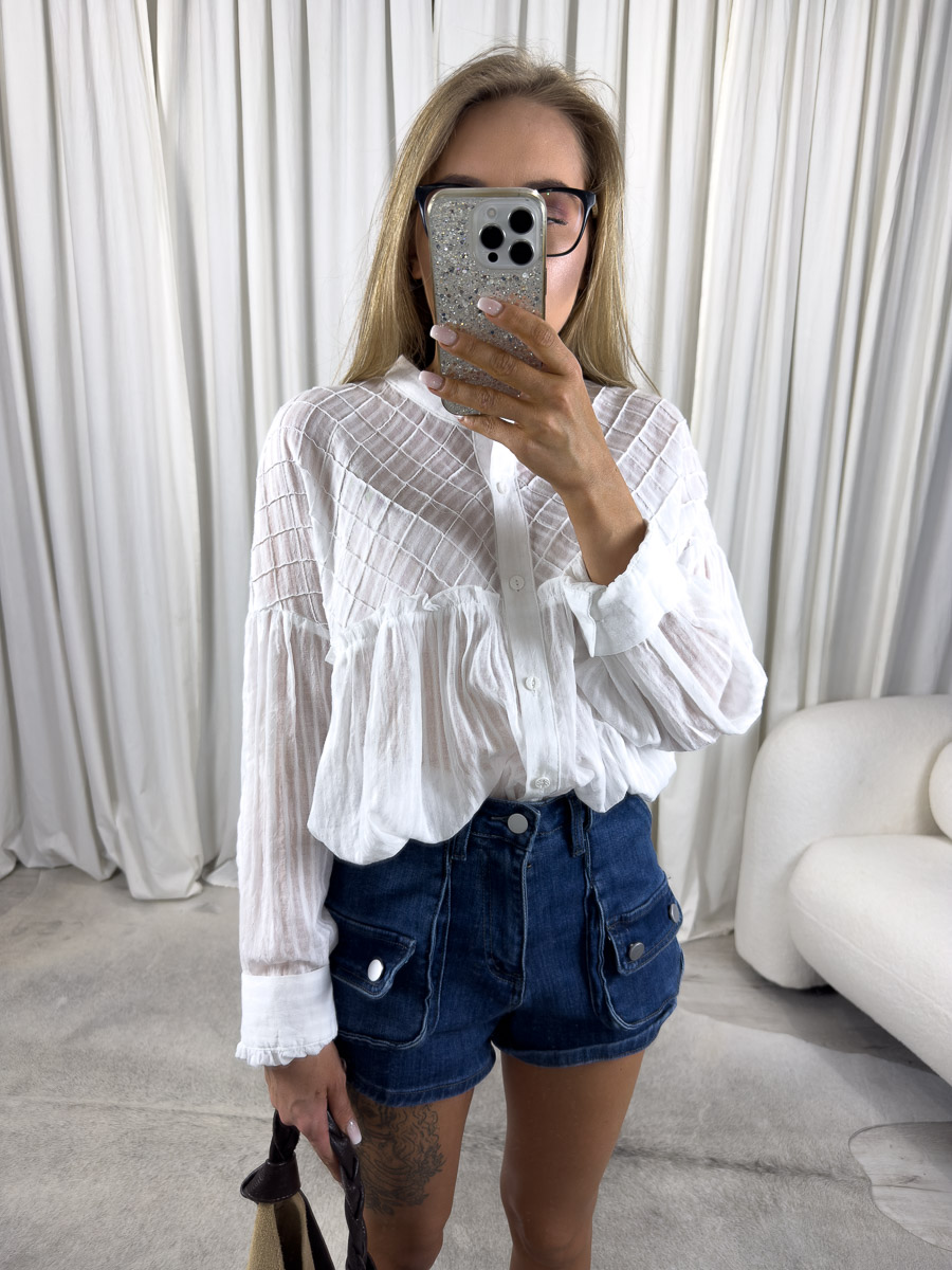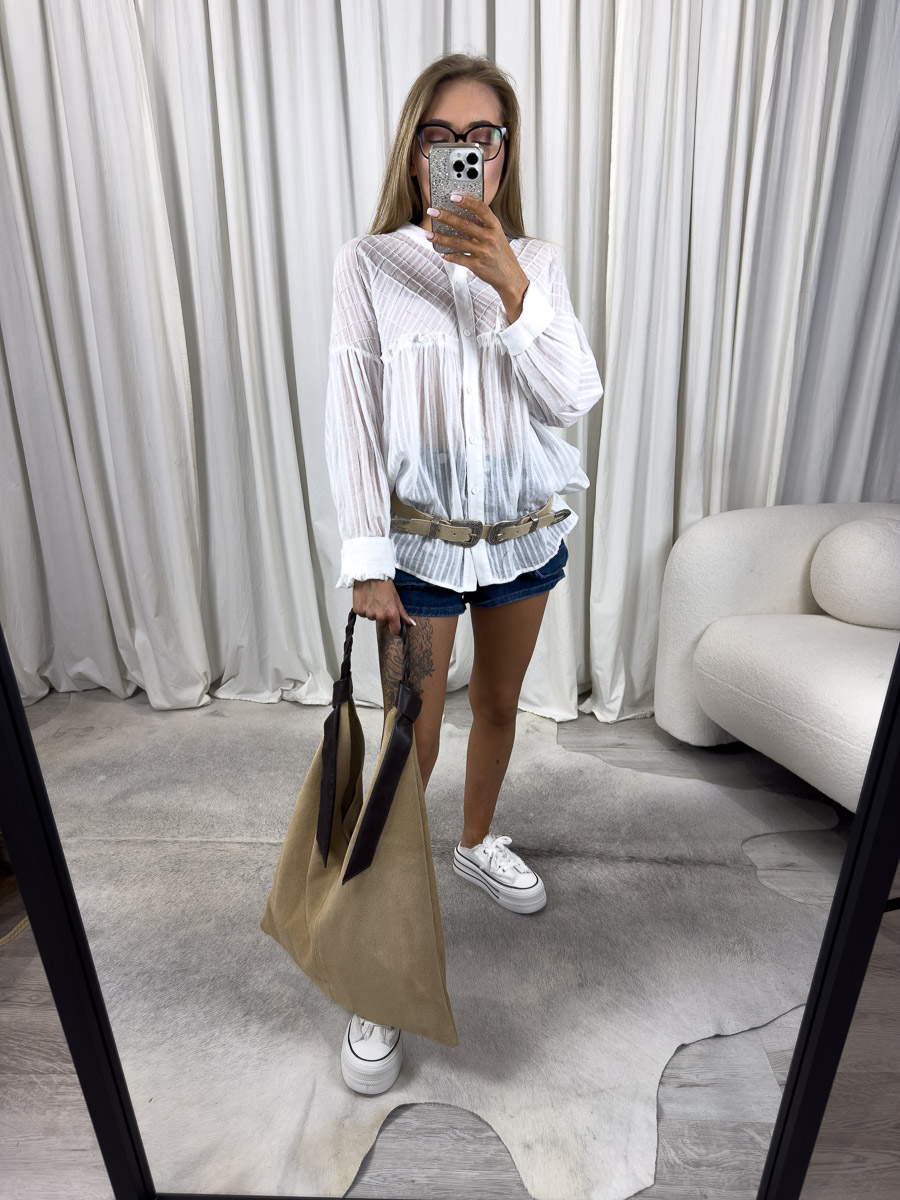 Ten model wyróżnia się nie tylko krojem, ale także subtelnymi detalami. Marszczenia, karbowana faktura tkaniny i lekko bufiaste rękawy zakończone mankietami dodają jej charakteru. Koszula Elle Wiya doskonale prezentuje się zarówno w stylizacjach casualowych, jak i bardziej eleganckich. Można ją nosić wpuszczoną w spodnie z wysokim stanem, jak na zdjęciu, lub rozpiętą na top, tworząc warstwową stylizację o nieco boho charakterze.