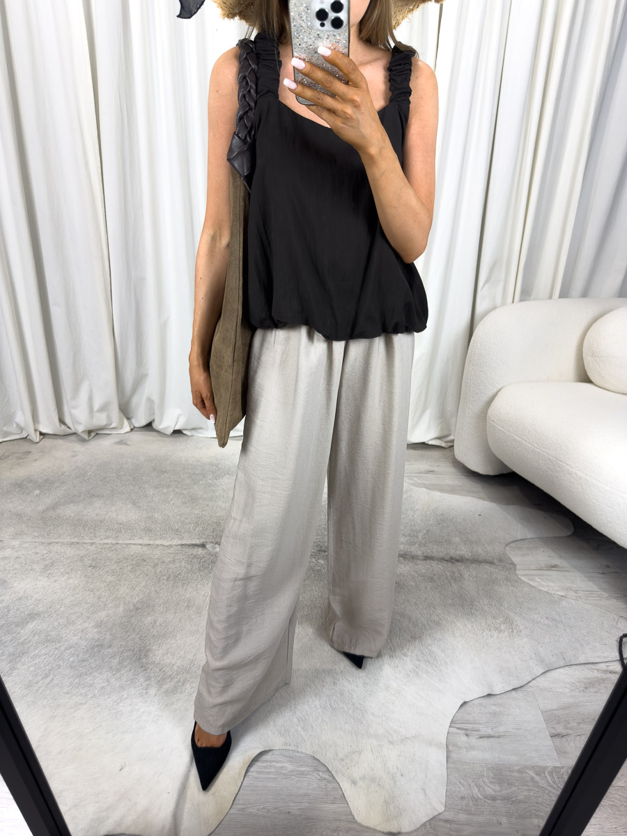 Model ten został zaprojektowany z myślą o gorących dniach – tkanina delikatnie układa się na sylwetce, nie przylega do ciała, a jednocześnie efektownie podkreśla kobiece proporcje. Wysoki stan optycznie wydłuża nogi i wysmukla sylwetkę, natomiast szerokie nogawki dodają całości lekkości i nonszalancji. To spodnie, które możesz nosić od rana do wieczora – do pracy, na spacer, na kolację przy zachodzie słońca.