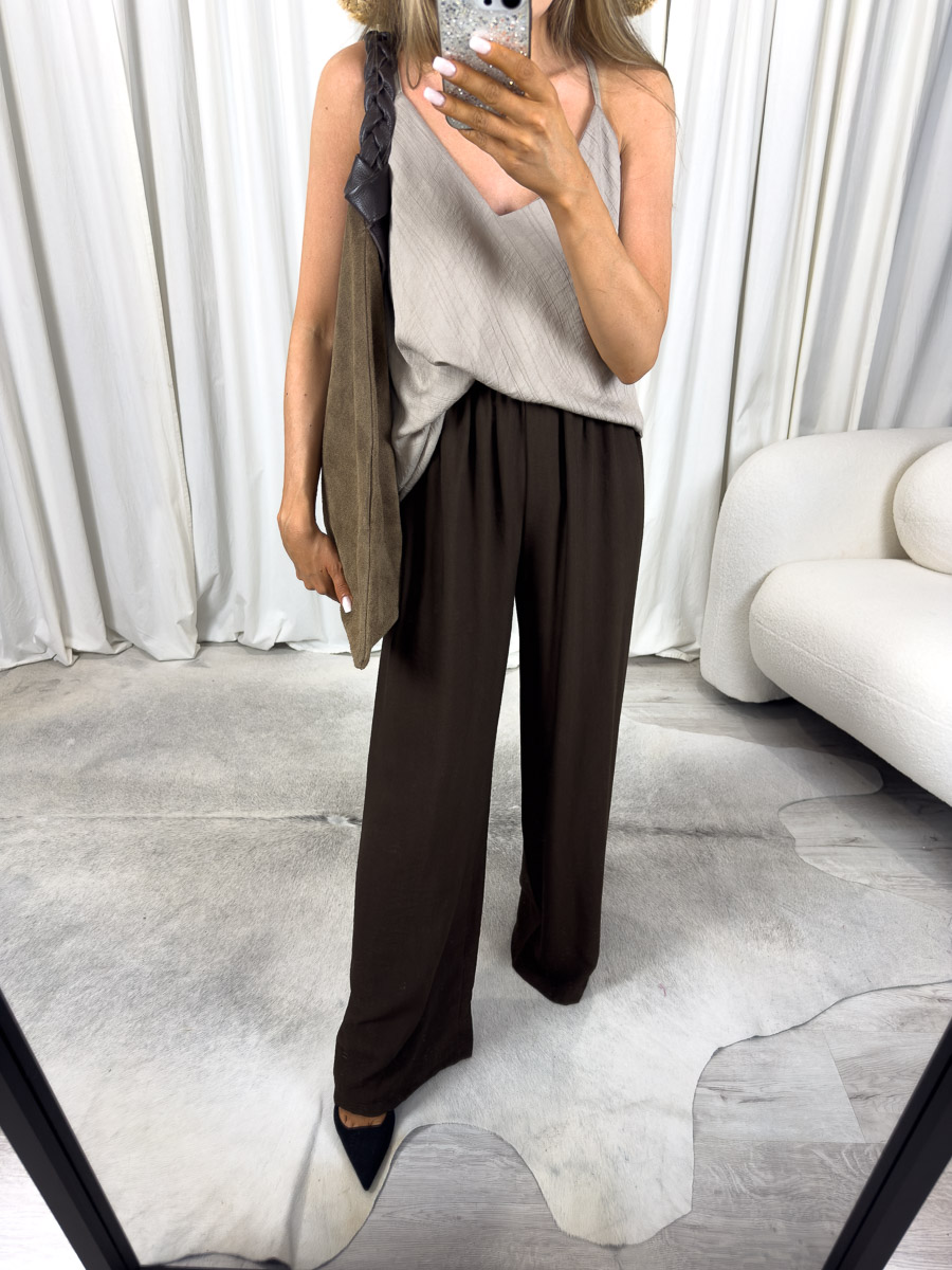 Model ten został zaprojektowany z myślą o gorących dniach – tkanina delikatnie układa się na sylwetce, nie przylega do ciała, a jednocześnie efektownie podkreśla kobiece proporcje. Wysoki stan optycznie wydłuża nogi i wysmukla sylwetkę, natomiast szerokie nogawki dodają całości lekkości i nonszalancji. To spodnie, które możesz nosić od rana do wieczora – do pracy, na spacer, na kolację przy zachodzie słońca.