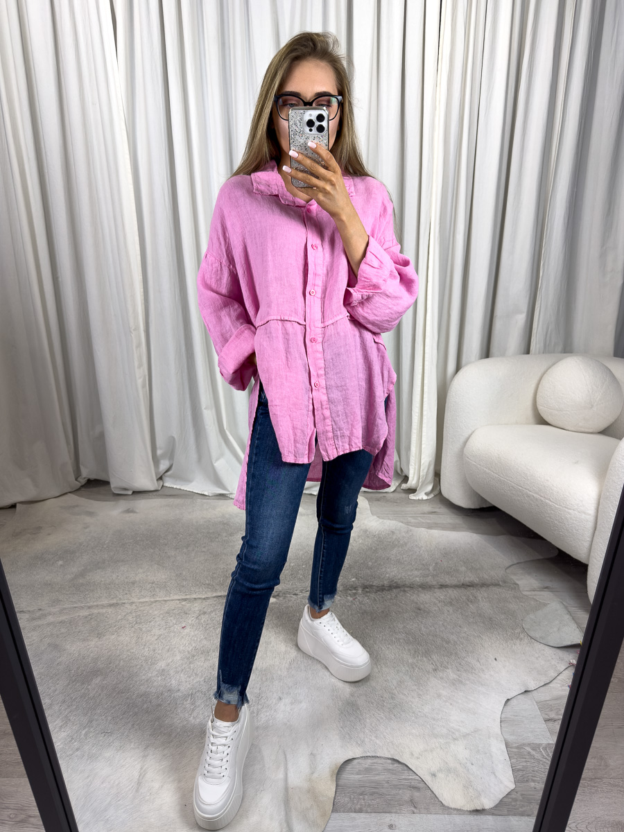 Lniana koszula Lori Wiya różowa to kobieca, lekka propozycja z naturalnego lnu. Oversize’owy fason i pastelowy odcień tworzą idealny duet na lato.