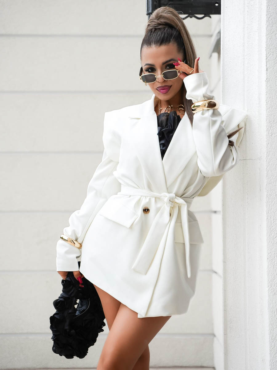 Marynarka oversize Lil Glam biała z paskiem – modna, elegancka i szyta w Polsce. Noś ją jako marynarkę lub sukienkę!