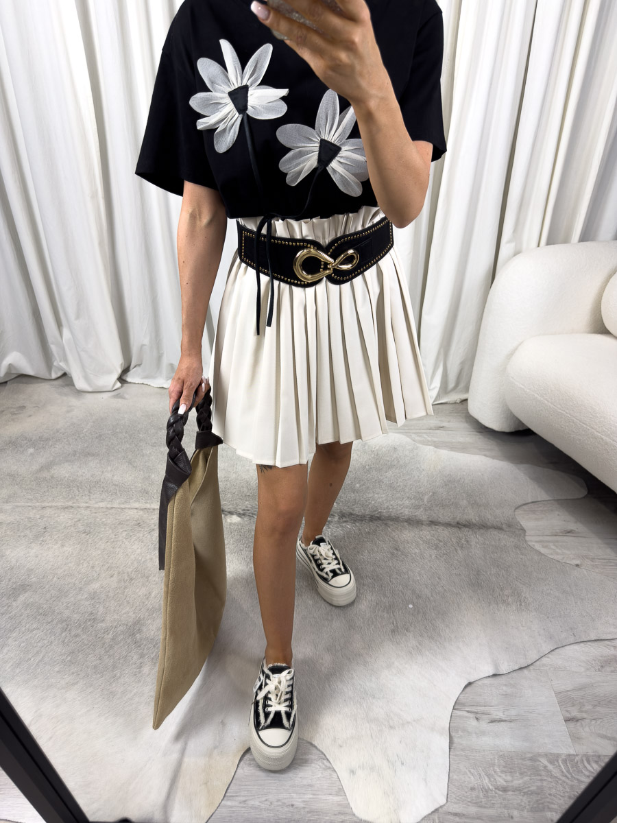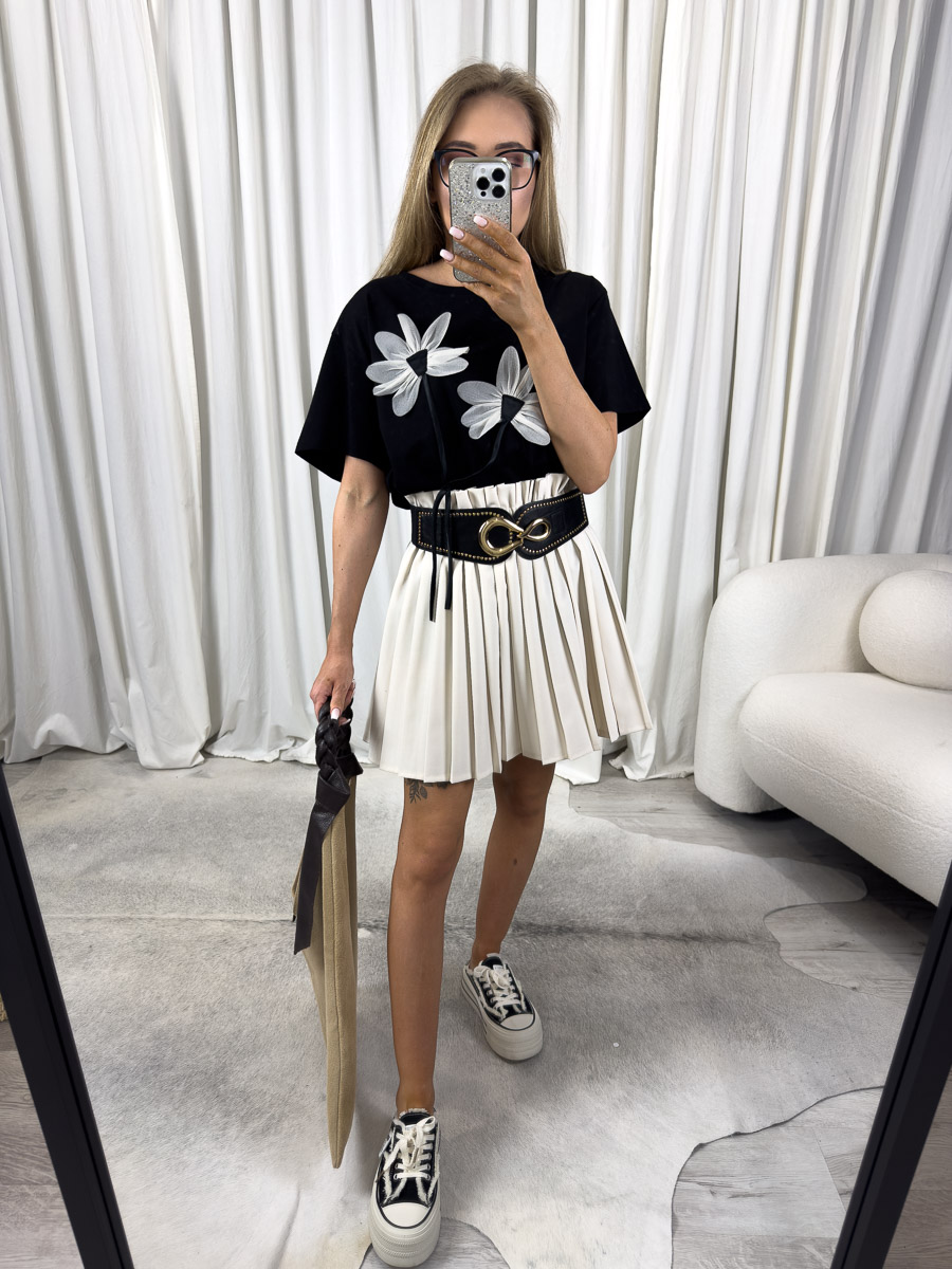 Spódnica plisowana Daily świetnie wygląda z klasycznymi koszulkami, krótkimi topami, a także luźnymi bluzkami wkładanymi do środka. Można ją zestawić z trampkami, balerinami lub sandałami, w zależności od okazji. W chłodniejsze dni dobrze wygląda również z lekką ramoneską lub jeansową kurtką. Dzięki swojej formie pasuje do każdej sylwetki i wpisuje się w wiele stylów – od romantycznego po miejski luz.