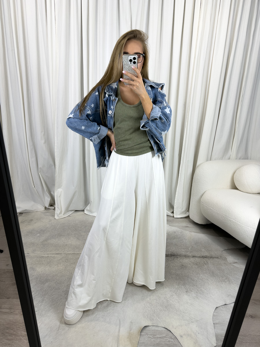Model zachwyca szerokimi, zwiewnymi nogawkami, które pięknie układają się podczas ruchu, nadając stylizacji lekkości oraz delikatnego, zmysłowego charakteru. Kremowy kolor to synonim elegancji i klasy, a jednocześnie doskonała baza do stylizacji zarówno w jasnych, jak i kontrastujących tonacjach.