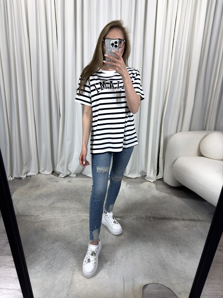 T-shirt Malibu granatowy łączy ponadczasowe pasy z nowoczesnym nadrukiem. Wygodny krój, miękka bawełna i uniwersalny styl sprawiają, że będzie niezastąpionym elementem Twojej codziennej garderoby.