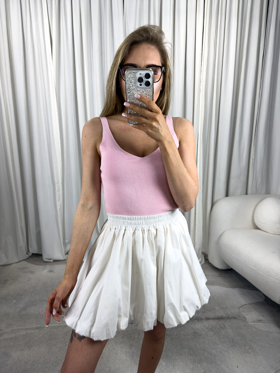Wykonany z przyjemnej w dotyku, prążkowanej dzianiny, top idealnie dopasowuje się do ciała, a jednocześnie pozostaje elastyczny i przewiewny. Szerokie ramiączka zapewniają wygodę oraz dobre podtrzymanie. Głęboki, ale delikatnie zaokrąglony dekolt w serek eksponuje ramiona i szyję, co sprawia, że całość wygląda bardzo kobieco.