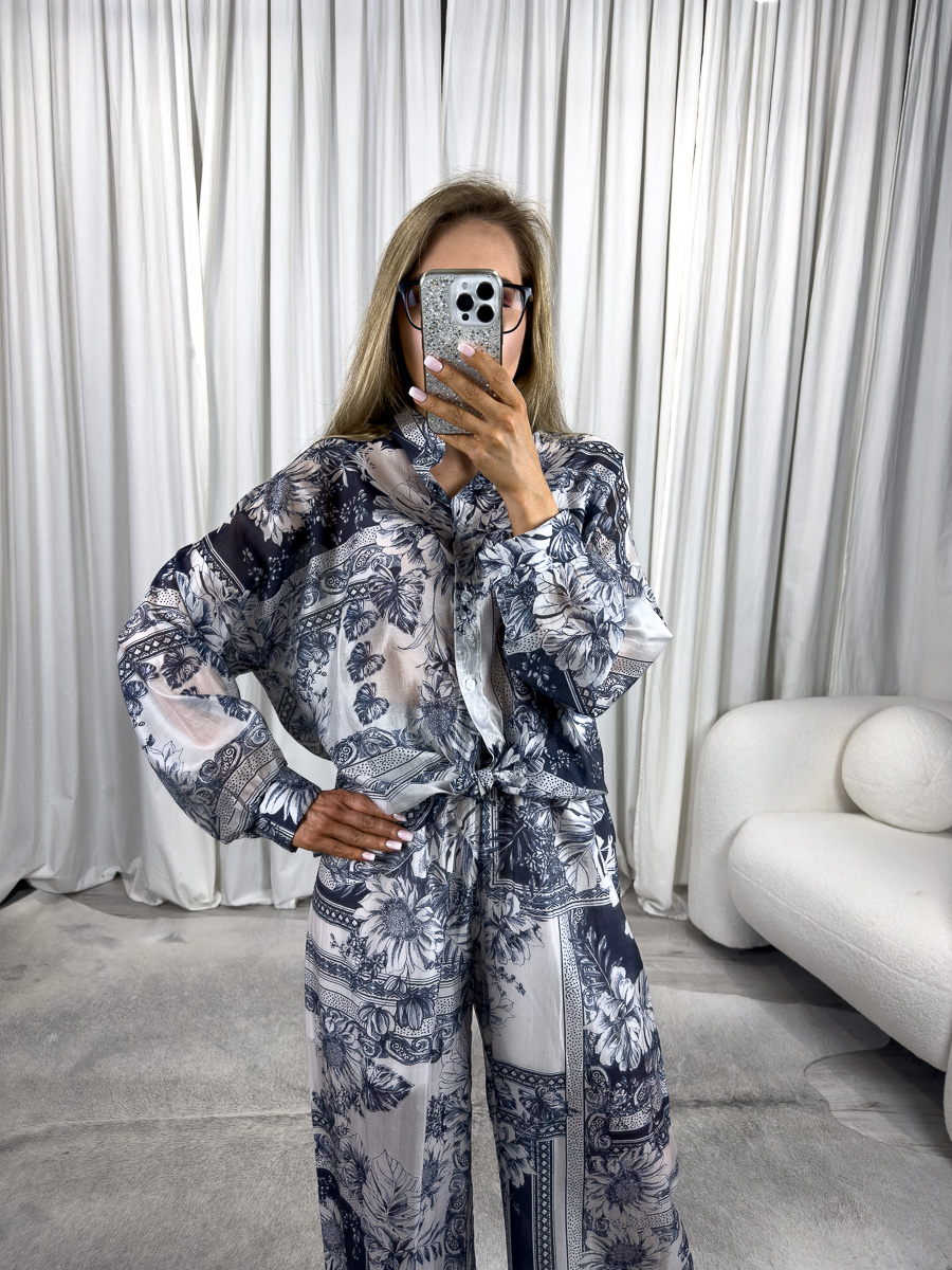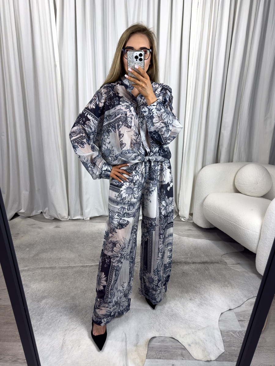 Delikatny, artystyczny print florystyczny na całej powierzchni zestawu dodaje mu subtelności i sprawia, że każda stylizacja z jego udziałem wygląda lekko, świeżo i elegancko. Oversize’owa góra z klasycznym kołnierzykiem i wiązaniem w pasie daje możliwość stylizowania jej na wiele sposobów – noszonej luzem, wpuszczonej do spodni lub związaną, by podkreślić talię. Spodnie w stylu palazzo gwarantują komfort przez cały dzień i idealnie komponują się z każdym typem sylwetki.